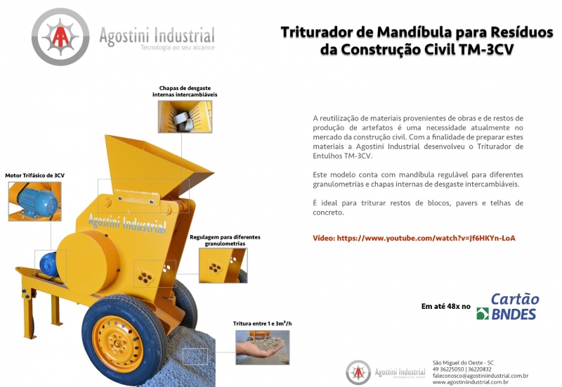 O Triturador de Entulho TM-3CV foi desenvolvido pela Agostini Industrial com o objetivo de triturar resíduos da construção e de fábricas de artefatos de concreto.